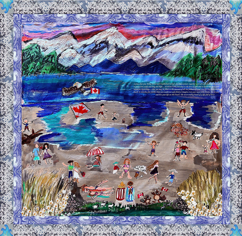 This is a collectors scarf hand-painted by Cydney Mariel Galbraith. The painting is of Rathtrevor Beach, British Columbia. This beach is a special place in her hometown Parksville, British Columbia. Childhood memories of running for miles and miles on this beach until the tide comes in! Treasures and natural wildlife surround this beach. It is a lively place but oh so peaceful. Of course this painting it can be any beach to you, but Rathtrevor beach is a very special place to many.