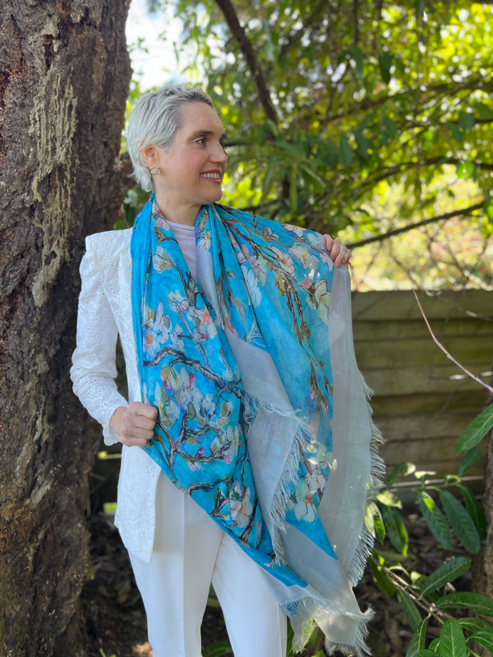 Forever may you flourish like the almond tree. As you wear this slovely almond blossom textile. Be inspired. You were created to flourish in love! Almond blossoms have a significant meaning in Hebrew - "wakeful hastening" because of its early blossoms in Israel around February each year. The blossoms are angelic snowflakes on a stunning artistic branch that reaches out and grasps the world with its beauty and sweet fragrance. Be encouraged! You were bound to reach out and forever flourish for all that you take hold of for the beauty of life! Like the almond blossoms, they bear rich, rich fruit from the tree - meaty and satisfying almond nuts that bring nourishment and savor to the world. Wear this lovely almond blossom shawl and forever may you flourish and bear everlasting fruit of subsistence!